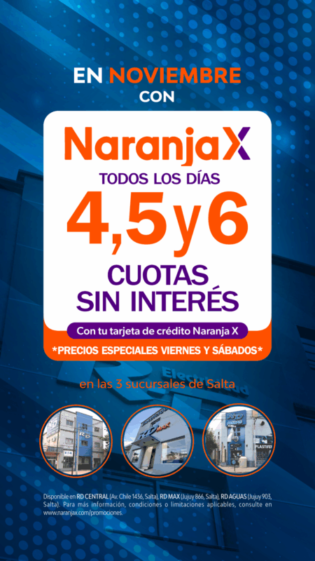 Disponible en RD CENTRAL (Av. Chile 1436, Salta), RD MAX (Jujuy 866, Salta), RD AGUAS (Jujuy 903, Salta). Para más información, condiciones o limitaciones aplicables, consulte en www.naranjax.com/promociones.